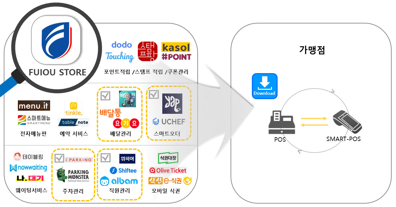 가맹점에서 필요한 기능이 있을 때, 에프케이에서 제공하는 단말기(POS, Smart-POS)에 탑재되어 있는